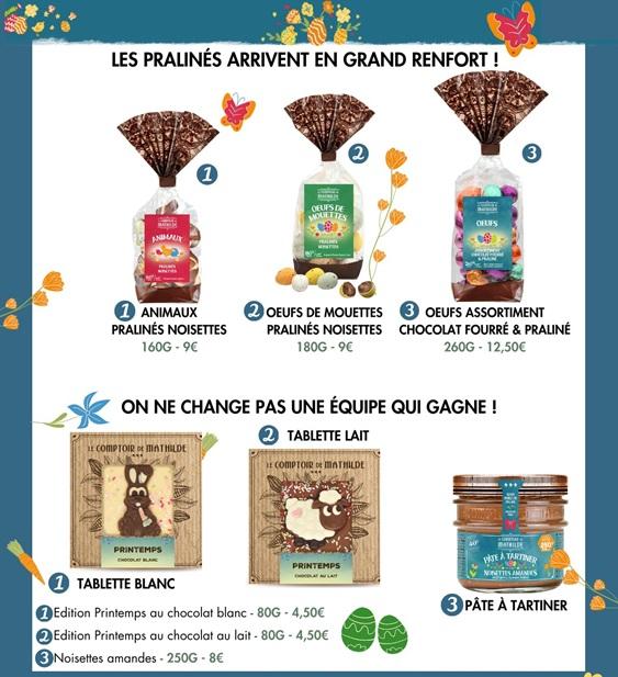 Que vous soyez amateur de chocolat noir, au lait ou blanc, il y en a pour tous les goûts et toutes les préférences. Les chocolats du Comptoir de Mathilde sont le cadeau idéal pour égayer les tables et les paniers de Pâques, apportant une touche de magie et de délice à cette fête printanière.